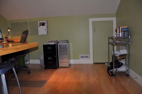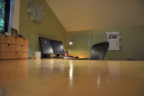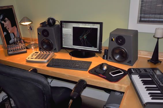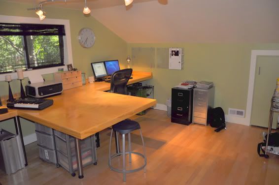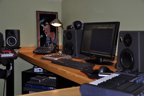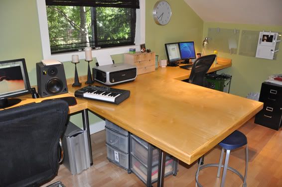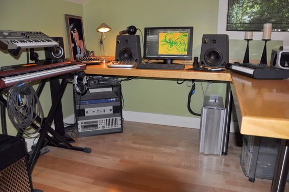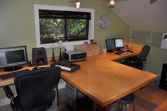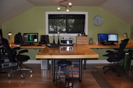 "This is the product of a remodel job I did in my home, replaced window, installed a new Maple floor, baseboards and rim, put in a reeded glass door and custom built in the desk. I couldn't find a desk that served my purposes so I just built one into the space. I custom ordered the legs and the rest was taken care of with a few trips to home depot. I really wanted the separation between "work" space and "creative" space... And with all this audio equipment, I didn't want to overcrowd myself when I was paying bills, working from home, or anything like that. It's really a good "his & her's" setup, but I took both sides for myself. The ceiling is only 4' high on either side, but the paint scheme and the configuration makes good use of the limiting height. I took this into consideration that I had to keep the middle area open to access the desks."