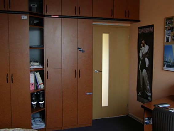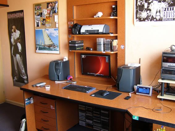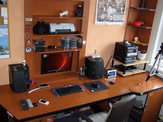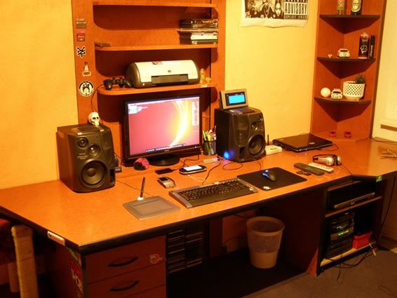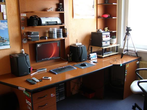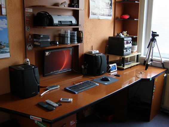 "So something about my workspace. This workspace is combined with my bedroom so I work where I sleep :). It's located in a small room. The table and other furniture in this room is your typical Ikea furniture and has been slightly modified for my needs. The small shelf on the right side in the window corner is a modified TV rack which I use with my laptop and audio equipment. I use this workspace for my multimedia needs, I like to watch HD movies (I use the blue ray drive in my laptop and connect it to my full HD Asus LCD screen). I used to have this lcd on a factory stand but it was dangerous because of my cat. She has thrown it down many to times so I decided to put my LCD on the wall. Instead of having her keep knocking it down, I made my own LCD holder from the side cover of old computer case. I also use this workspace for my work needs (audio/graphics) as I now work as an advertise creator for one TV broadcast station in my city Olomouc in Czech Republic."